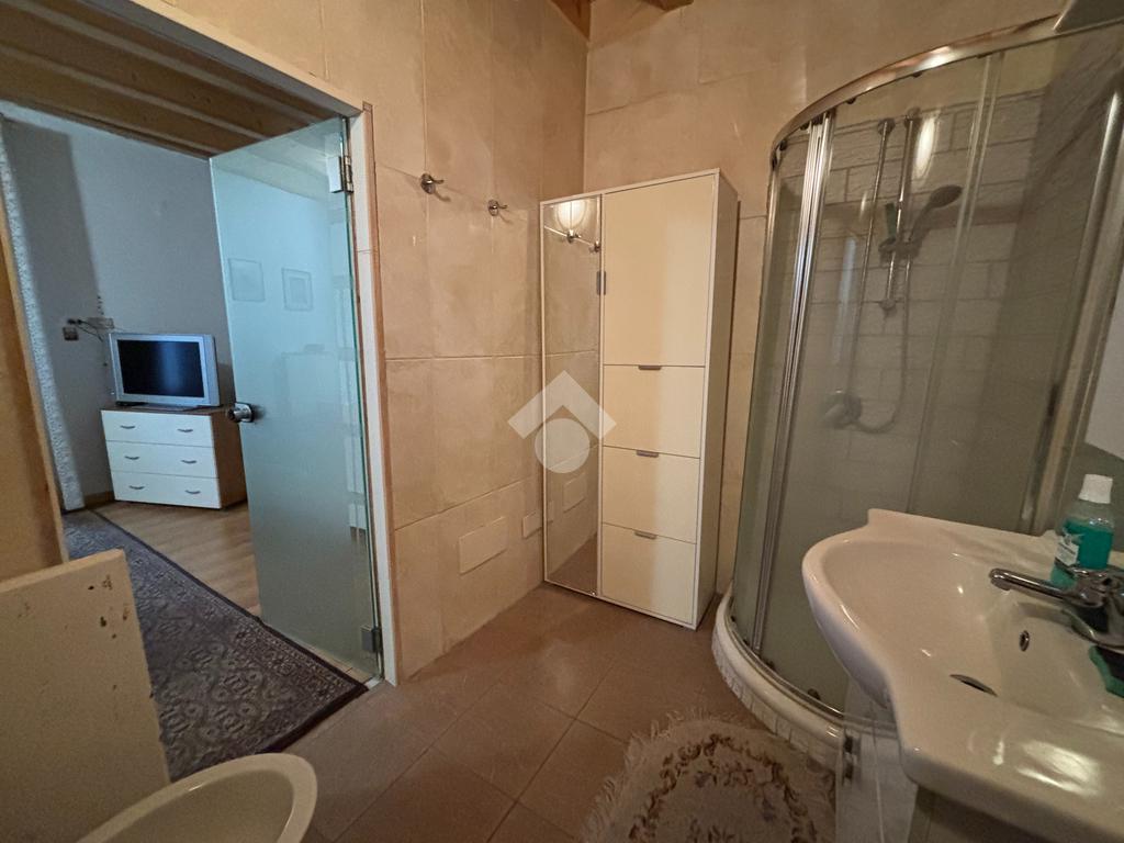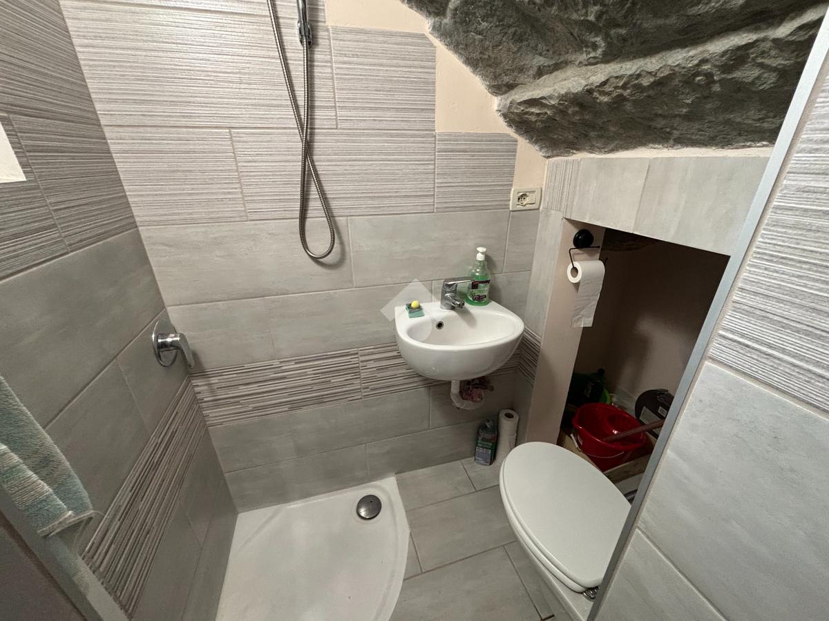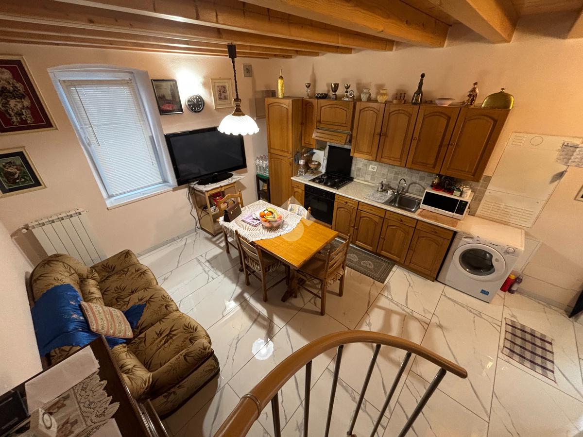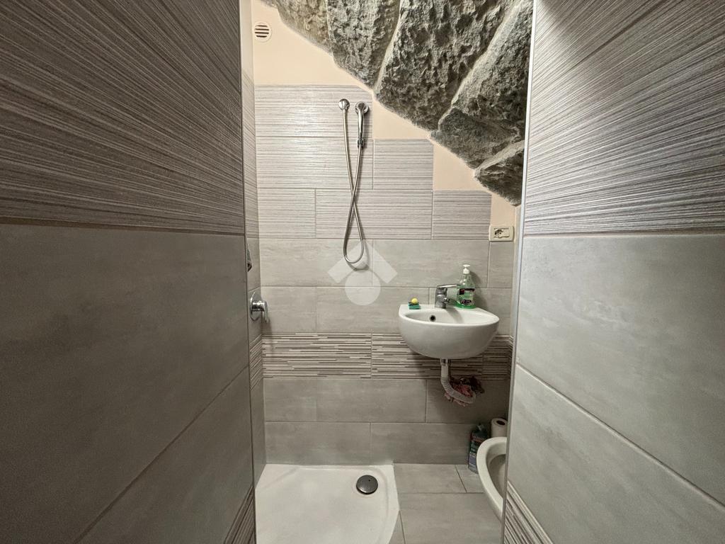 L’ingresso apre su un luminoso soggiorno open space con parete cucina a vista e primo servizio finestrato completo di doccia.